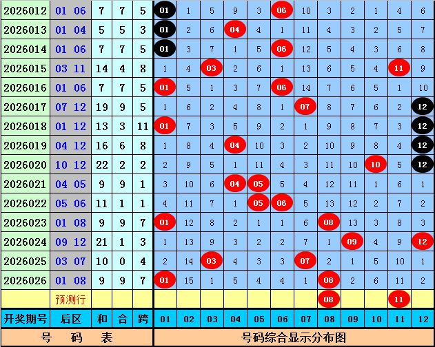 后区奖号分析:上期后区开出奖号01+08,奖号和值为9,跨度为7,本期后区注意和值走大,参考两码08 11。