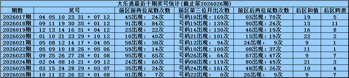 体彩大乐透第2026026期奖号为:10 11 22 26 32+01 08,前区号码大小比开出3:2,012路比开出0:2:3,奇偶比开出1:4,后区号码和值开出9,跨度开出7。